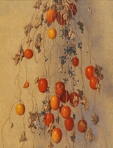 とりわけ初期の静物画は果物や陶器などの形がゆがんでいて、物があたかも意志をもっているような強い存在感を発しており、木の枝や花の茎もまるで生き物のように生々しい。