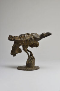 烏や鳩のキーワードはそれ自体が人間にとっても、そして創造者の「道標」だそうだが、とても飛びそうにない、いや、飛ぶエネルギーを秘めた生命ある存在の充実したバランスを開示しているという意味で、裸婦のテーマと共通する。尻尾が白菜や舞茸のように扇状に開いているものが多く、作り手のイマジネーションを飛ばす「道標」となってくれる異形の鳥たちであった。